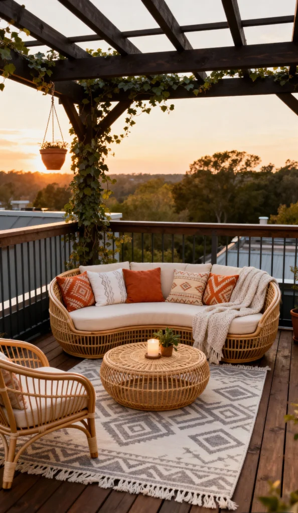 What a stylish rooftop deck! The curved, light-toned wicker sofa and matching coffee table are an absolute statement. It feels incredibly chic and comfortable. The burnt orange and neutral geometric cushions, along with the cozy throw, inject that perfect dose of warm, earthy, bohemian style. Based on image 6.jpg, the dark pergola structure provides a lovely frame and the decking makes it feel grounded, all while enjoying a sunny, elevated perspective.