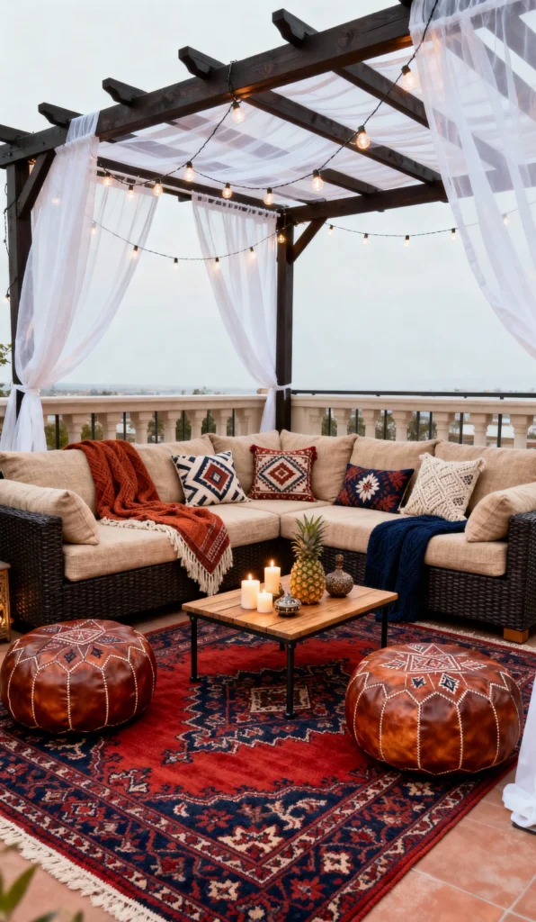This rooftop space is dripping with opulent Bohemian style! The rich color palette, especially that striking red and navy patterned rug, really makes the neutral seating pop. the deep wicker sectional, Moroccan leather poufs (or ‘pouffes’), and the sheer white curtain panels draped from the pergola create an incredible sense of drama and enclosure. It’s an exotic, layered, and incredibly comfortable spot—perfect for lounging and watching a sunset with an amazing view.