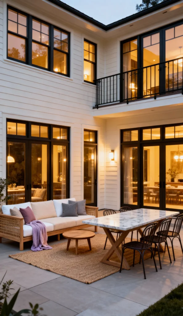 This is sleek, bright, and utterly sophisticated! the clean lines of the white siding, black-framed windows, and metal balcony railing give it a modern farmhouse feel. The outdoor furniture—a clean-lined, neutral sofa and the statement marble-top dining table—keeps the look light and airy. It’s a perfect example of how a few key pieces, like the textured jute rug, can warm up a concrete patio without sacrificing that polished, contemporary vibe. Great for entertaining both formally and casually!