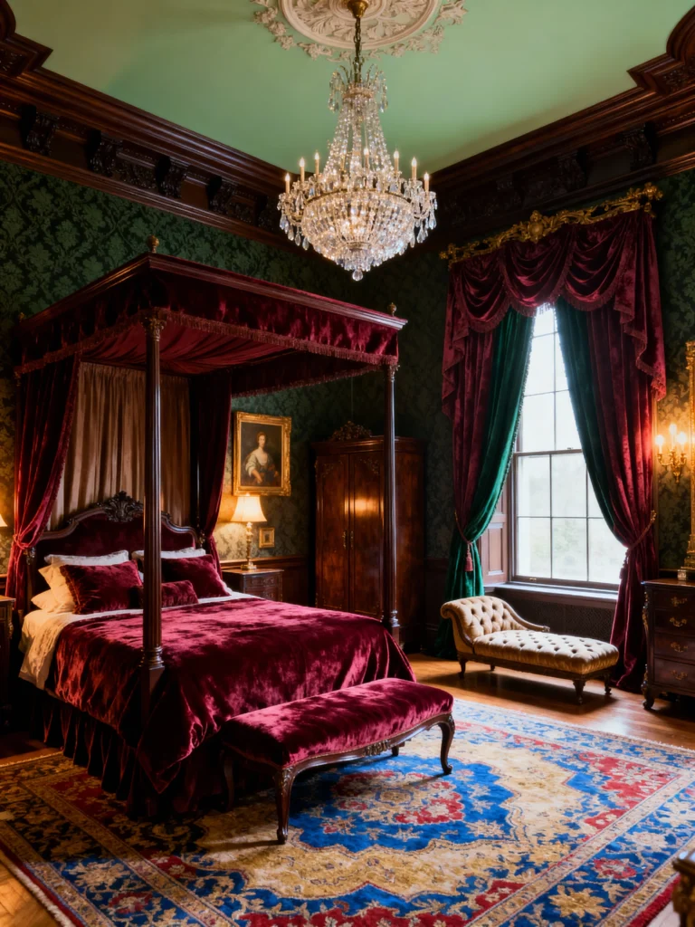This room has gorgeous deep emerald green damask wallpaper and a contrasting pale green/mint ceiling, which is a unique twist. Your eyes are immediately drawn to the majestic red velvet four-poster canopy bed—it’s the epitome of romance. The large, colorful, patterned rug in blues, reds, and golds pulls all the room’s primary colors together beautifully. See that chaise lounge by the window? It’s the perfect spot to curl up. It feels like a space that has centuries of history and stories woven into its very fabric.