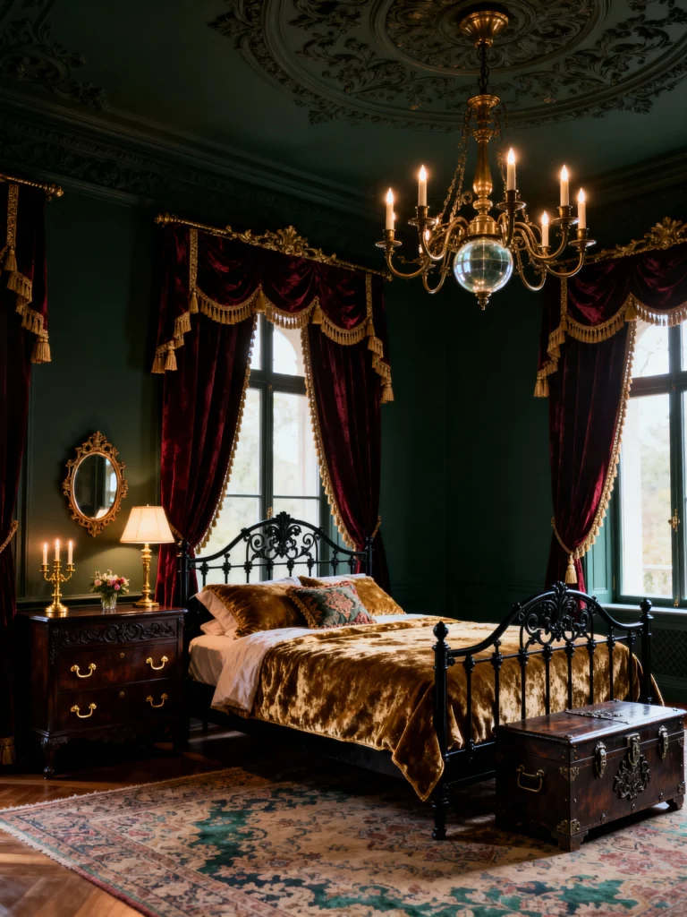 Moving to something a little more brooding and mysterious—this room is dark, handsome, and undeniably chic. The walls are a dark forest green, almost black, and the ceiling has this incredible, highly detailed molding, also in a dark color. Instead of an ornate wooden bed, we have a classic black wrought-iron frame, which gives it a slightly more gothic or Victorian feel. The curtains are a deep, rich red velvet with gold fringe—such an elegant contrast to the dark walls. The whole space feels moody, romantic, and perfectly lit by that antique brass chandelier and the soft lamplight.
