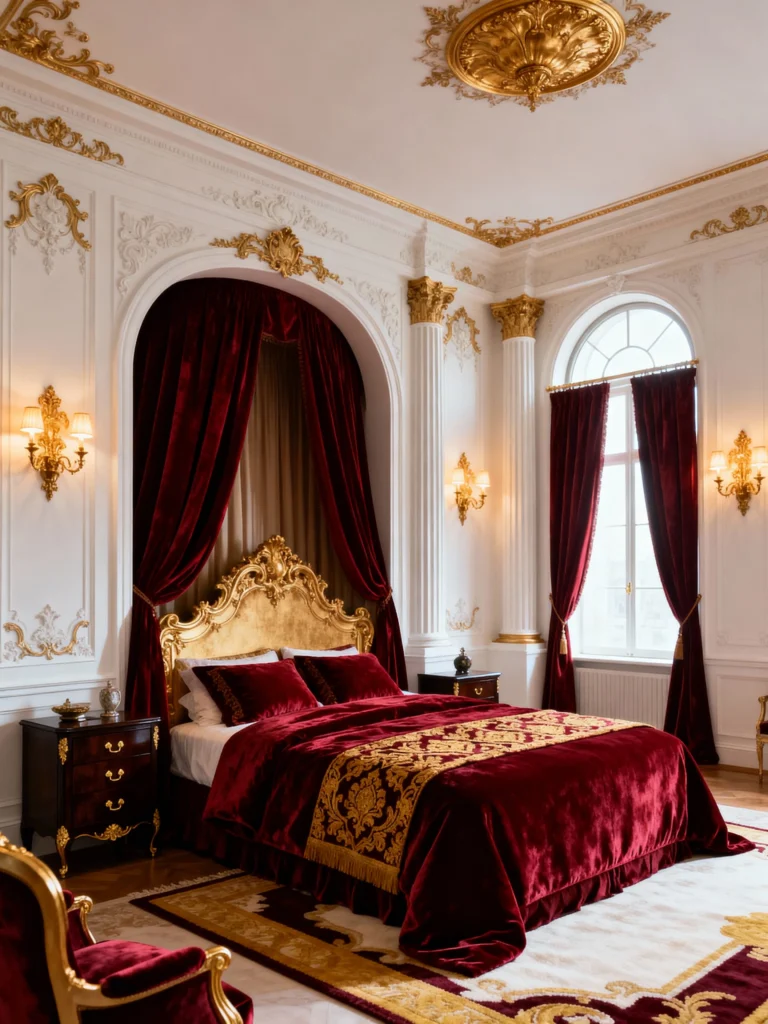 Prepare to be dazzled, because this room is pure fire! The rich, blood-red velvet covering the walls and the tufted headboard gives off major royal palace energy. It’s bold, it’s passionate, and paired with the generous amounts of ornate gold trim and detailing on the ceiling, walls, and furniture, it’s a showstopper. The bed itself, dressed in that plush red velvet, looks unbelievably comfortable. A grand room like this needs an equally grand light fixture, and that huge, sparkling crystal chandelier delivers! It truly captures the essence of classic European opulence.