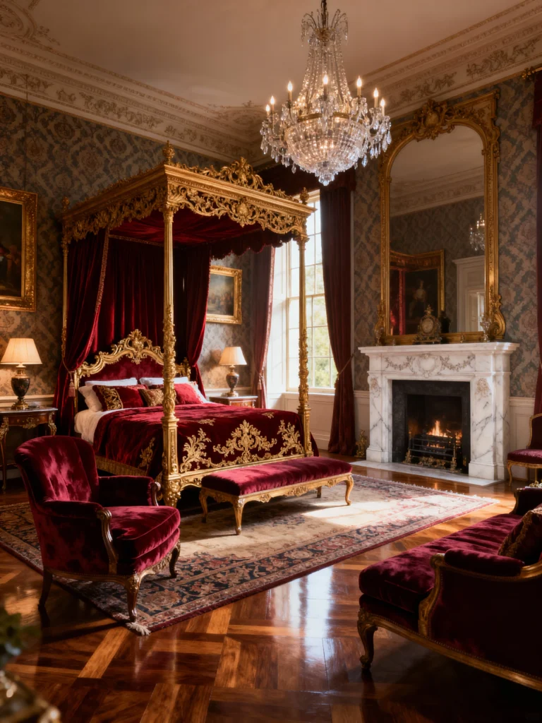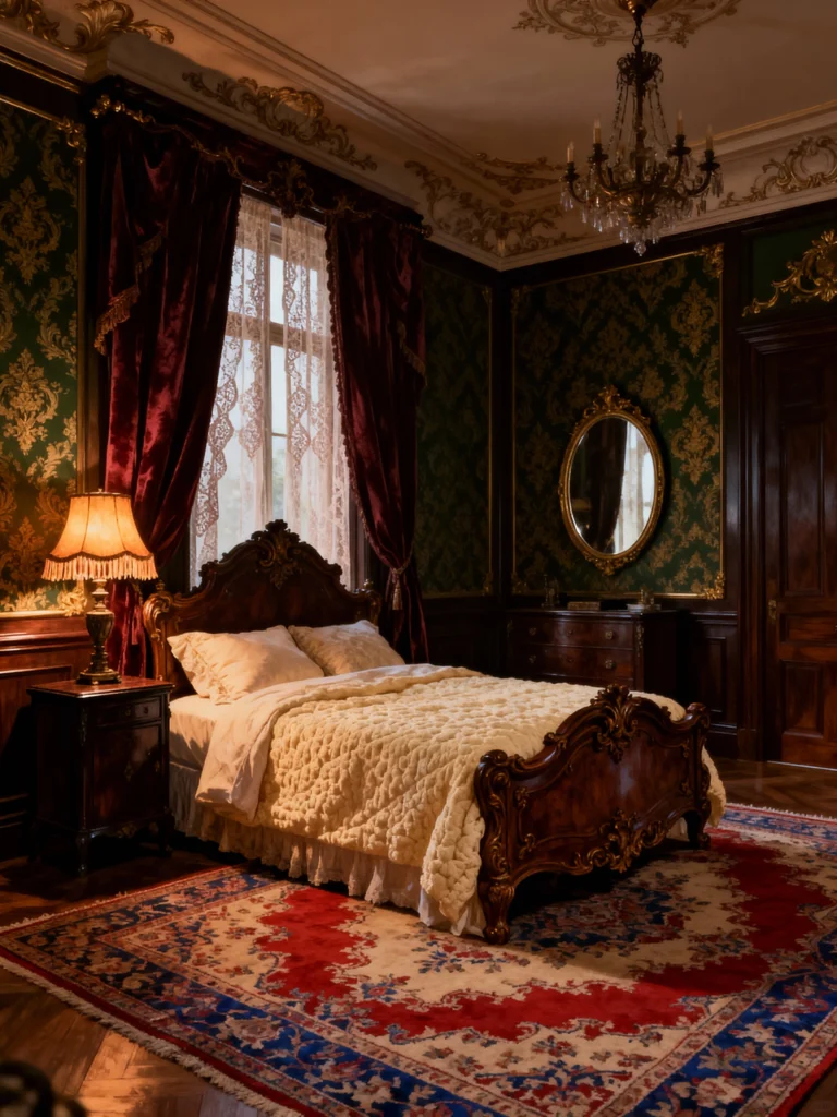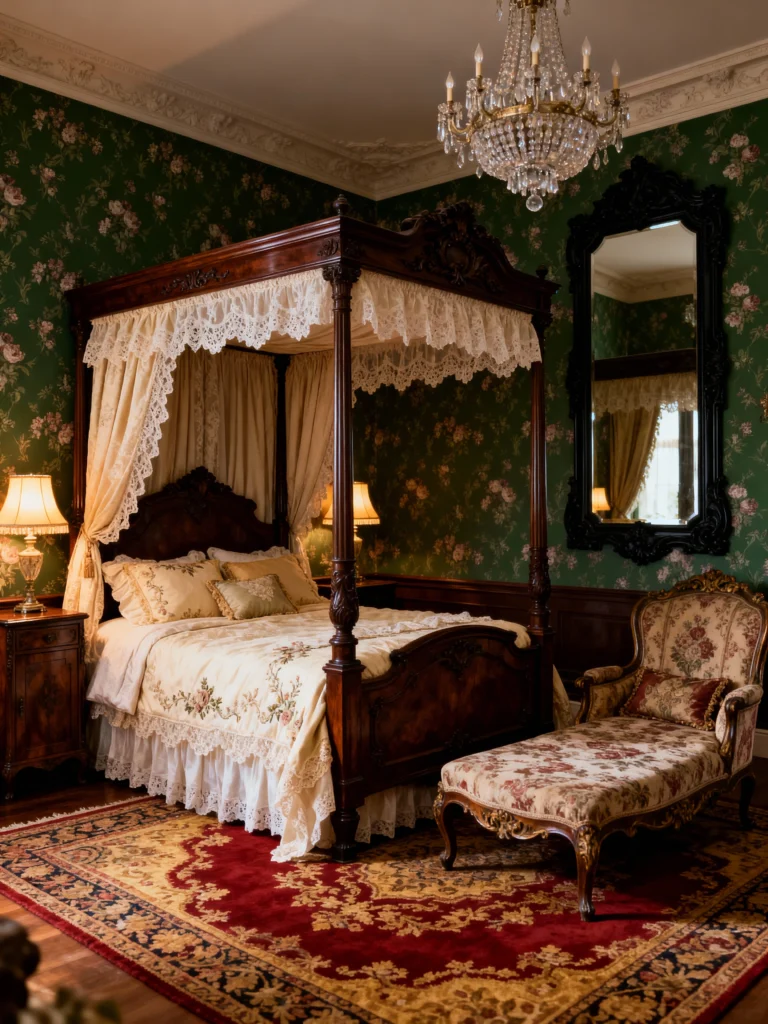 Okay, this one has a slightly different, more cozy, yet still highly elegant vibe. The first thing you notice is that beautiful, dark wood four-poster bed with its creamy lace and floral canopy—it’s so romantic! The walls are covered in a deep, dark floral wallpaper that sets the perfect mood. See how the heavy, dark wood frames and the rich, jewel-toned rug ground the room? Everything here feels warm, like being wrapped in a luxurious blanket. That crystal chandelier adds the perfect sparkle, and the dark, ornate mirror is a fantastic focal point. It’s truly a classic, warm, and inviting space.