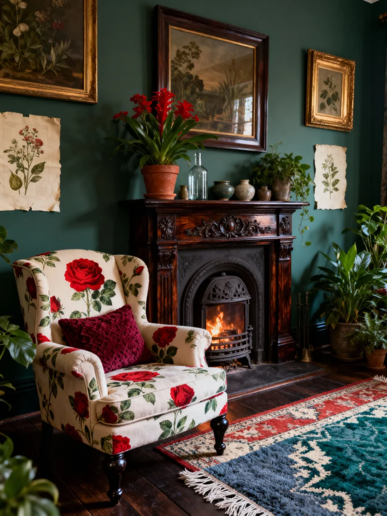 There is something so incredibly grounded about a deep forest green wall. It makes everything else in the room just pop. I love how this space doesn’t shy away from being dramatic. That fireplace is an absolute showstopper—it looks like it has a hundred stories to tell. But the real “wow” factor? That wingback chair with the giant red roses. Usually, you’d think of a floral chair as something in Grandma’s house, but against that dark backdrop, it feels edgy and bold. Throwing in a mismatched, textured rug and a few botanical prints makes the whole thing feel like a cozy secret garden. It’s the perfect spot to curl up with a book and a glass of wine while the fire crackles.