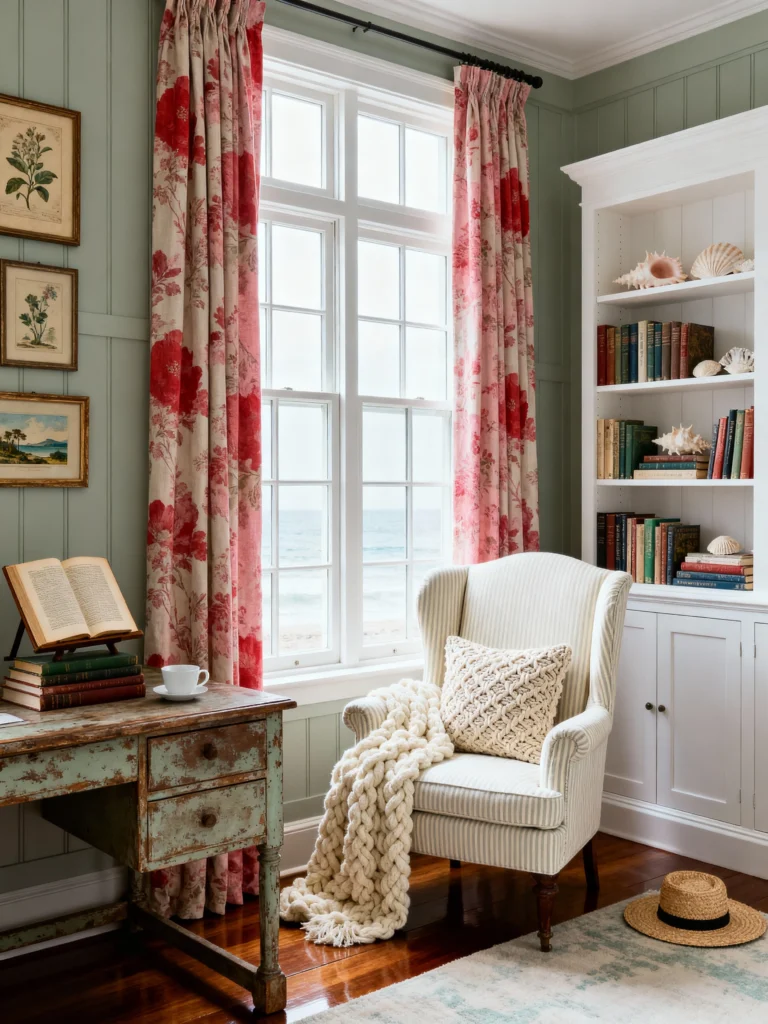 This is the ultimate “me time” corner. The soft, sage green paneling immediately lowers your heart rate, and those oversized floral curtains bring in just the right amount of color. But the real hero here is that white striped armchair with the massive, chunky knit throw. It looks like the softest place on earth! I love how the bookshelf is styled with seashells and old books—it feels like a collection gathered over years of beach vacations. Whether you’re looking out at the ocean or just dreaming of it, this spot is all about peace, quiet, and comfort.