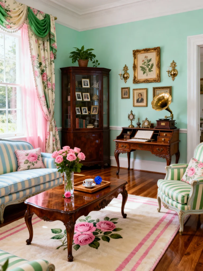 If the first room was a moody evening, this one is a bright Sunday morning. The mint green walls are so refreshing, and I am living for that “more is more” approach to the window treatments. Those layered pink and floral drapes are pure romance! What keeps this room from feeling too stiff is the mix of stripes on the furniture. You’ve got blue stripes on the sofa and green on the armchair—it’s a playful clash that totally works. Plus, that vintage secretary desk with the gramophone? It’s like a little time capsule. It’s elegant, yes, but it also feels lighthearted and ready for a tea party.