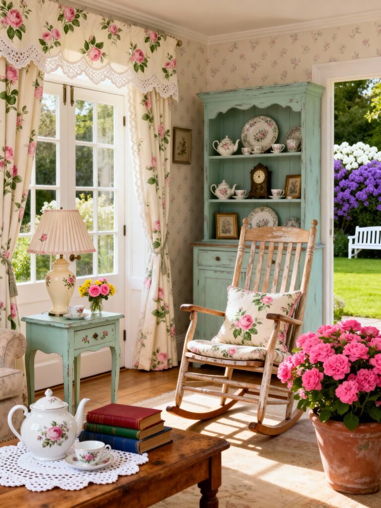 The first thing that hits you is the shabby-chic furniture. That minty-teal hutch and matching side table have just the right amount of “scuffed-up” charm to feel lived-in and loved. And don’t even get me started on the florals. From the curtains to the teacups and even that plush rocking chair cushion, the rose motif ties everything together without feeling too “grandma’s house.”