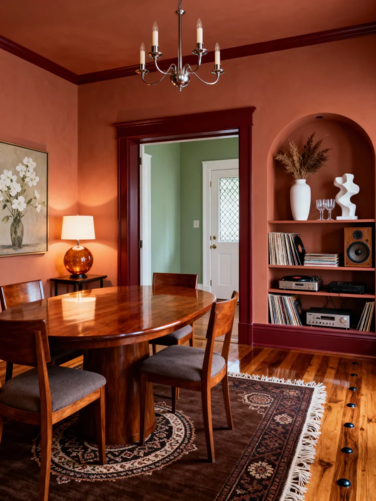 There is something so earthy and soulful about this dining room. Using that rich terracotta color on both the walls and the ceiling (don’t be afraid to paint your ceiling!) creates this “envelope” of warmth that is so inviting. Those arched built-in niches are a dream—they’re the perfect spot to show off a record collection and some sculptural art. The dark wood of the dining table and the wine-colored trim add a layer of moodiness that makes the room feel high-end but still very approachable. Imagine having a candlelit dinner here; the glow against those walls would be magical.