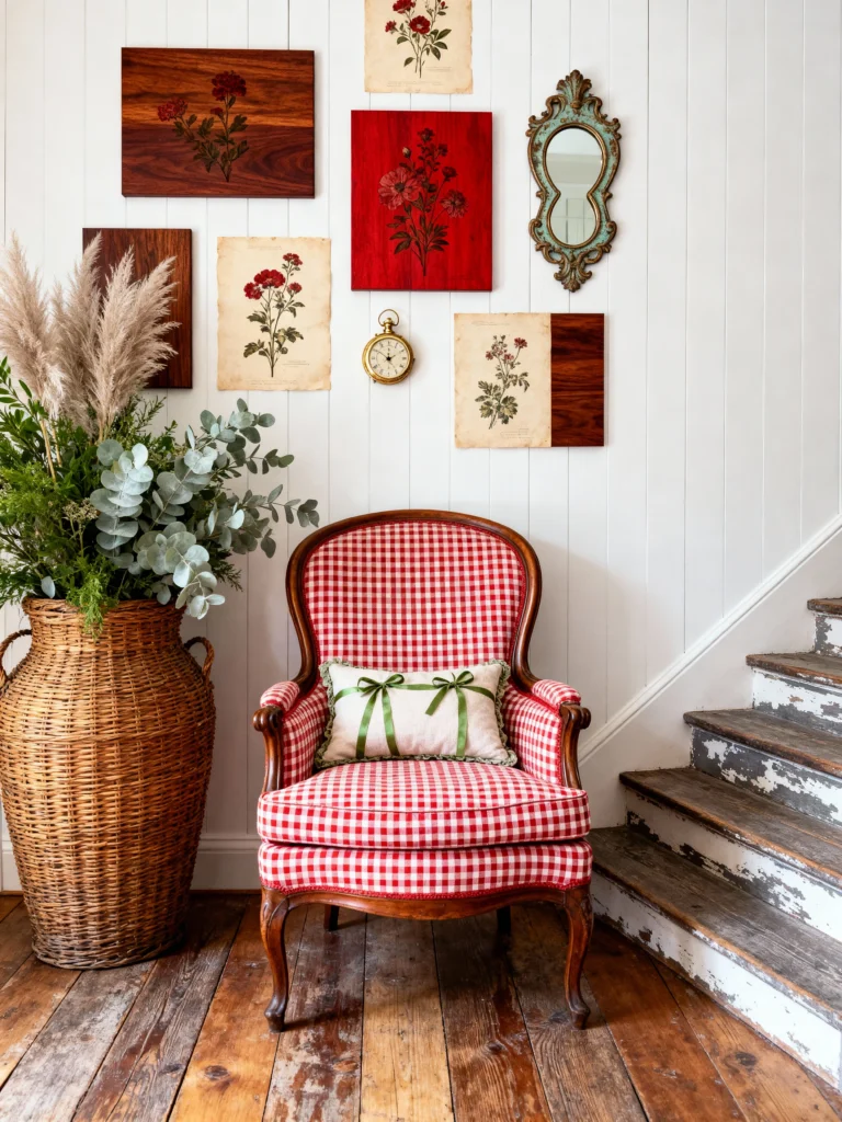 Sometimes, one perfect piece of furniture is all you need to define a space. This red and white gingham chair is just darling! It’s classic, it’s country, and it’s incredibly cheerful. Set against the simple white wood-paneled walls, it really stands out. I also love the “gallery wall” above it—mixing framed botanical art with pieces painted directly onto wood planks is such a creative touch. And that oversized wicker basket with the pampas grass? It adds a much-needed natural texture that keeps the space feeling relaxed and organic. It’s a little slice of cottagecore heaven right by the stairs.