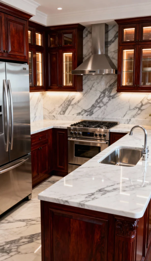 This kitchen is giving me serious classic elegance vibes! The rich, dark cherry cabinets have that timeless, polished look, beautifully contrasting with the bright, dramatic veining of the stainless steel and white marble (countertops and backsplash). It feels warm and luxurious, and those illuminated glass cabinets are the perfect touch to showcase your favorite pieces. Plus, the modern stainless steel appliances bring it right into the present day. What a perfect blend of traditional warmth and contemporary clean lines!