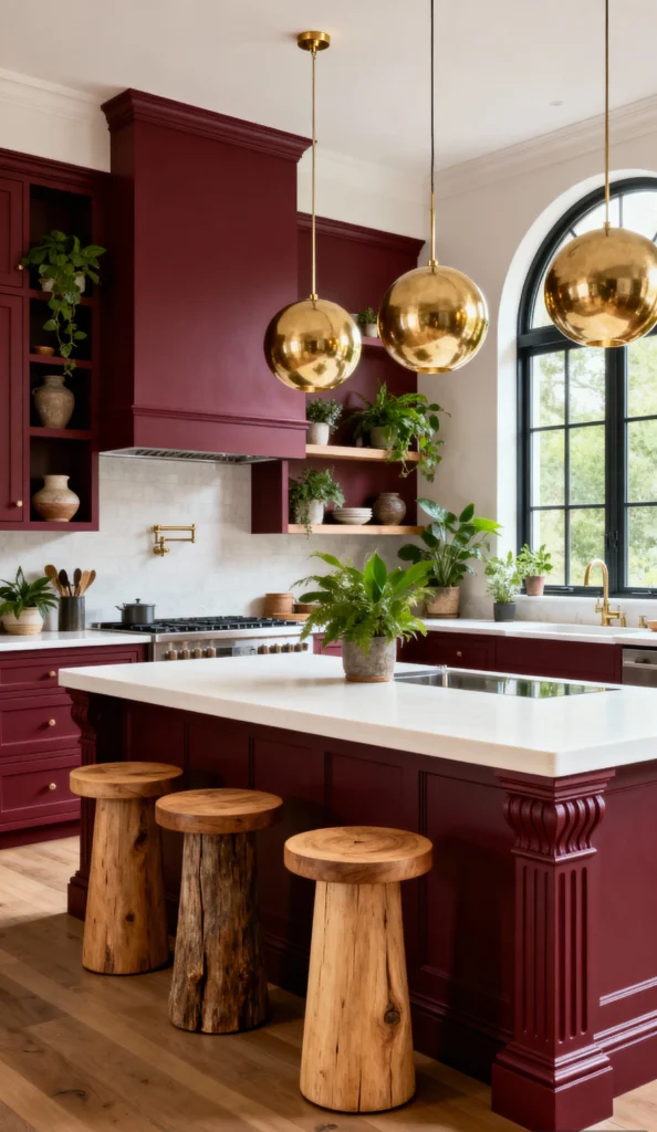 How perfect is this balance of rich color and natural elements? The matte, wine-red cabinets and custom hood provide a bold foundation, beautifully softened by the warm wood flooring and those fantastic, organic-looking log bar stools. The gold globe pendant lights add a fun, modern pop of metallic shine, and the addition of plenty of greenery makes the whole space feel fresh, inviting, and truly harmonious.