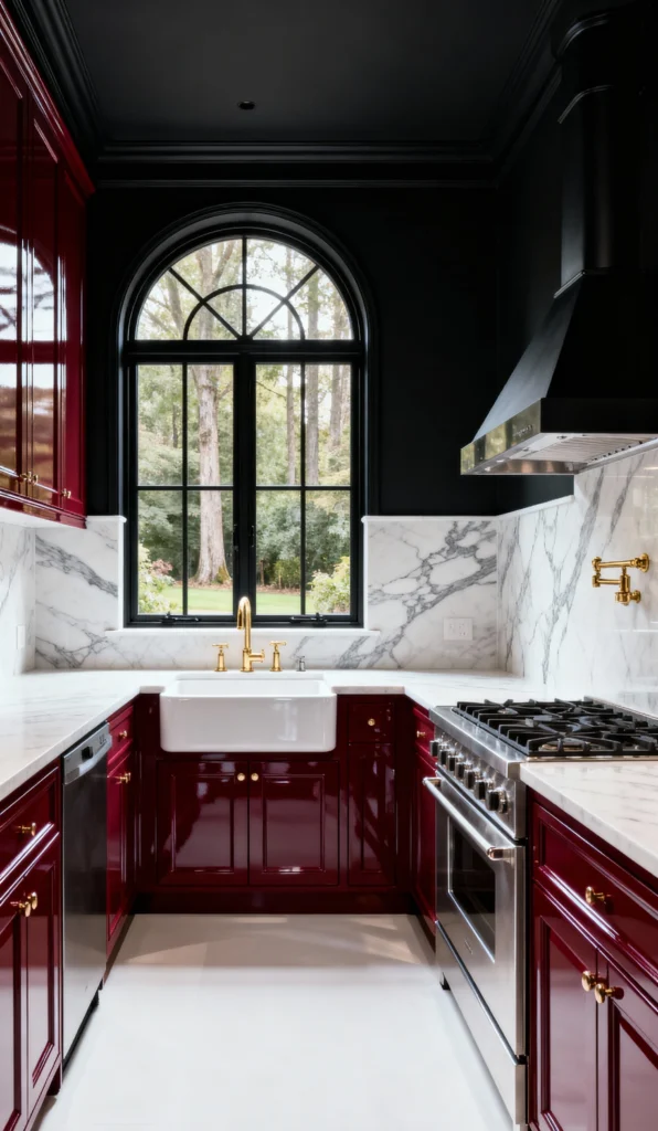 This little U-shaped kitchen is a masterclass in high-impact design within a compact space. The glossy cranberry cabinets pop beautifully against the stark black upper walls and ceiling—it’s incredibly chic! The white marble backsplash and countertops keep the look fresh and bright, while the brass faucet adds a touch of classic warmth. That large, arched window is the perfect focal point, bringing in natural light and a lovely view to balance the intense color scheme.