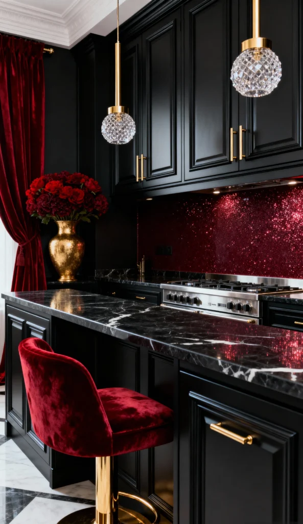 This is for the ultimate fashionista kitchen! It’s all about texture and intensity here. The black paneled cabinets provide a moody, elegant backdrop, allowing the sparkling ruby-red backsplash and those decadent velvet elements (hello, chair and curtain!) to truly shine. The gold hardware on the cabinets and the bar stool base just scream luxury. It proves that you don’t need a lot of red to make a massive, glamorous impact.