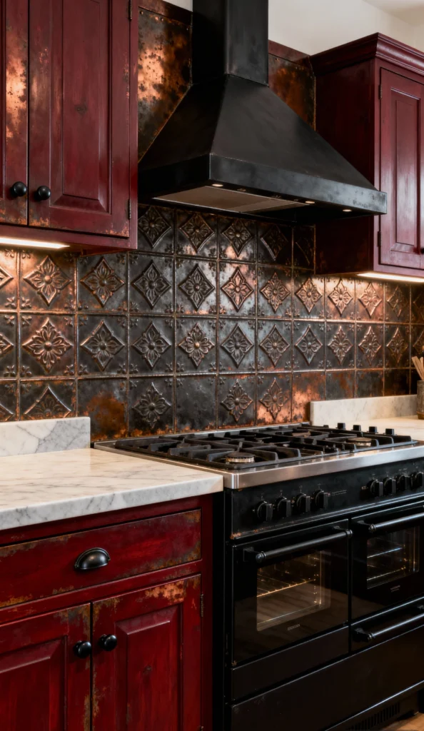 This image takes the red cabinet trend in a totally different direction—it’s wonderfully rustic and industrial! The distressed, deep cherry cabinets have so much character. But the real star is that oxidized copper tile backsplash. The mix of rustic red, dark metal, and the intricate, old-world pattern gives this space a cozy, almost historical feel. It pairs perfectly with the rugged black range hood and matching oven. A beautiful, lived-in luxury!