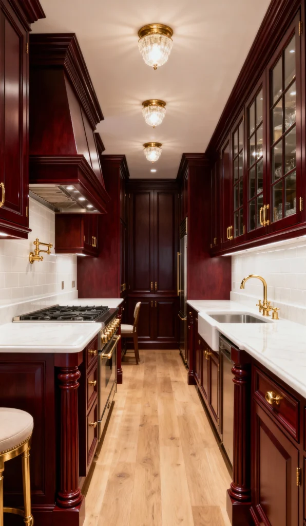 Even a galley kitchen can be utterly luxurious! The long, narrow layout is stunningly executed with those rich, polished cherry cabinets lining both sides. The white marble countertops and simple subway tile backsplash keep the space from feeling too heavy. Those classic brass fixtures and the warm ceiling lights add a beautiful, inviting glow. It feels highly organized, elegant, and perfectly appointed for a serious cook!