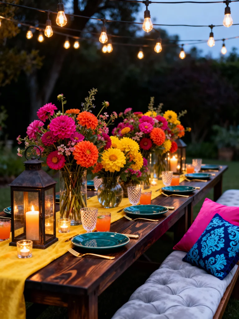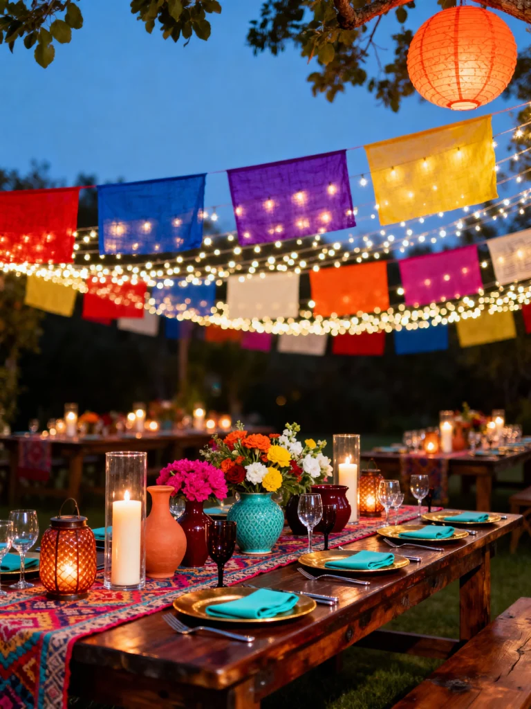 If you want high energy, look no further. This space is all about the “more is more” philosophy. The overhead string lights paired with the colorful flags (papel picado style) create a festive “ceiling” that makes the outdoor space feel like a private room. I’m obsessed with the teal and red vases—they add so much texture. It’s a total sensory experience that screams “taco night” or a big family reunion.