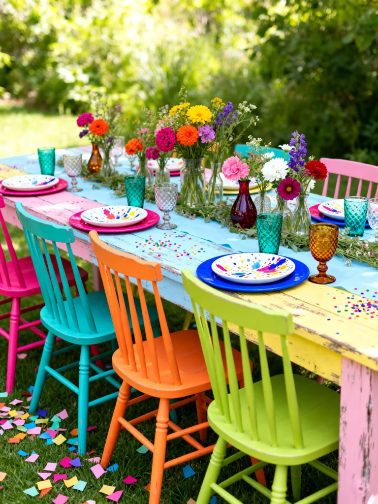 Okay, how fun is this? This setup is like a shot of espresso for your backyard. If you have old wooden chairs lying around, give them a second life with some mismatched, candy-colored paint. It’s whimsical and doesn’t feel too “perfect,” which is exactly what a summer brunch needs. The confetti on the table and the splattered plates make it feel like a celebration before the party even starts. It’s proof that you don’t need a huge budget—just a lot of color!