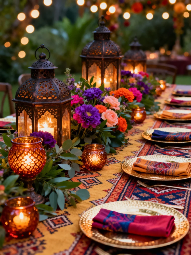 When the sun starts to go down, it’s all about the lighting. This table is a masterclass in “mood.” By layering intricate metal lanterns with smaller amber glass votives, you get this warm, flickering glow that reflects off the gold-textured plates. The patterned runner gives it a global, traveled feel. It’s sophisticated but still feels grounded and earthy. This is definitely the setup I’d choose for a milestone birthday or an engagement dinner.