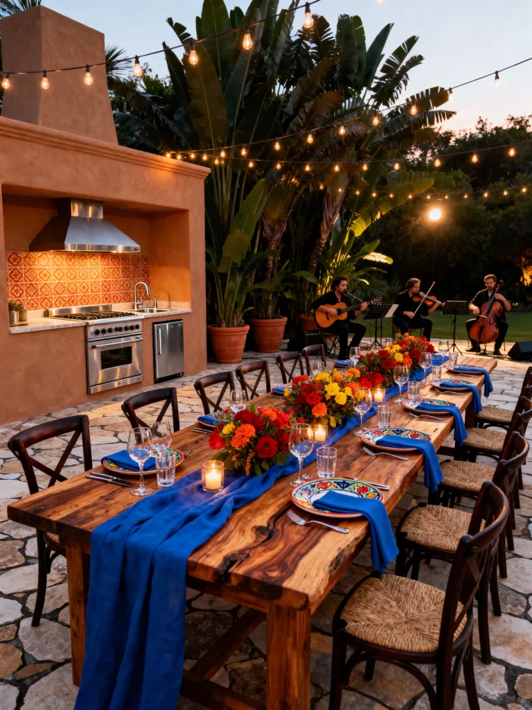 This setup is pure class. If you’re lucky enough to have a built-in outdoor kitchen, make it the heart of the party. The long wooden table with the deep blue runner feels very “upscale coastal.” But the real “wow” factor? The live trio playing in the background! It reminds us that a great party isn’t just about what you see, but what you hear. It’s a chic, airy space that feels totally professional yet completely comfortable.