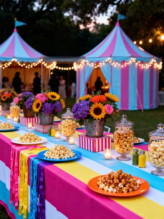 Last but not least, let’s go to the circus! This is such a creative theme for a kid’s party (or a kid-at-heart party). Those striped tents are incredible, but the popcorn bar is the real winner here. Putting snacks in apothecary jars and colorful bowls makes the food part of the decor. The bright striped tablecloth and the streamers hanging off the side keep the energy level at a 10. It’s pure, unadulterated fun.