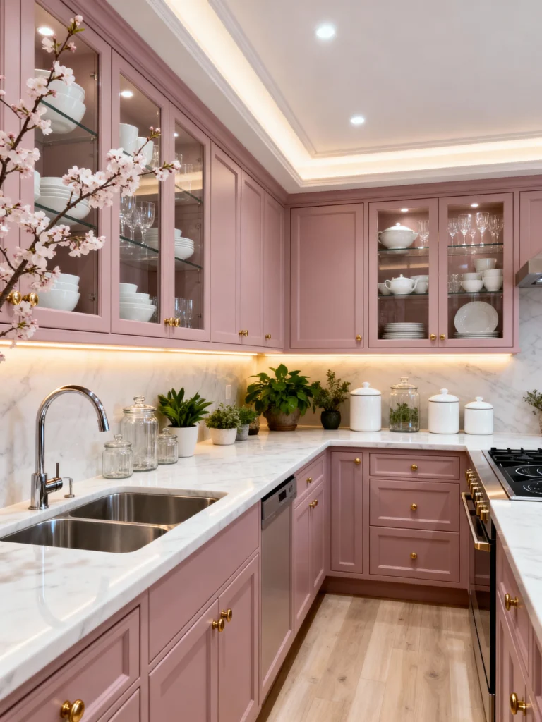 Okay, stop what you’re doing and just look at this kitchen. Seriously, how gorgeous is this color? If you thought pink cabinets were a risk, this space proves they are a must. It’s sophisticated, sweet, and totally unexpected. The dusky rose color is the main event, instantly making the room feel warm and inviting—not to mention, super unique! But what really makes it shine is the gorgeous white marble countertop and backsplash. That veining keeps everything feeling elegant and clean. Notice how the gold hardware on the cabinets and drawers just pops against the pink? It’s a perfect pairing! Plus, those glass-front upper cabinets are beautifully styled with crisp, white dishes. It truly feels like a place where you’d bake sourdough while sipping tea under the soft glow of that recessed lighting. And look, there are even cherry blossoms adding a delicate touch on the left! It’s all about mixing functional design with feminine charm.