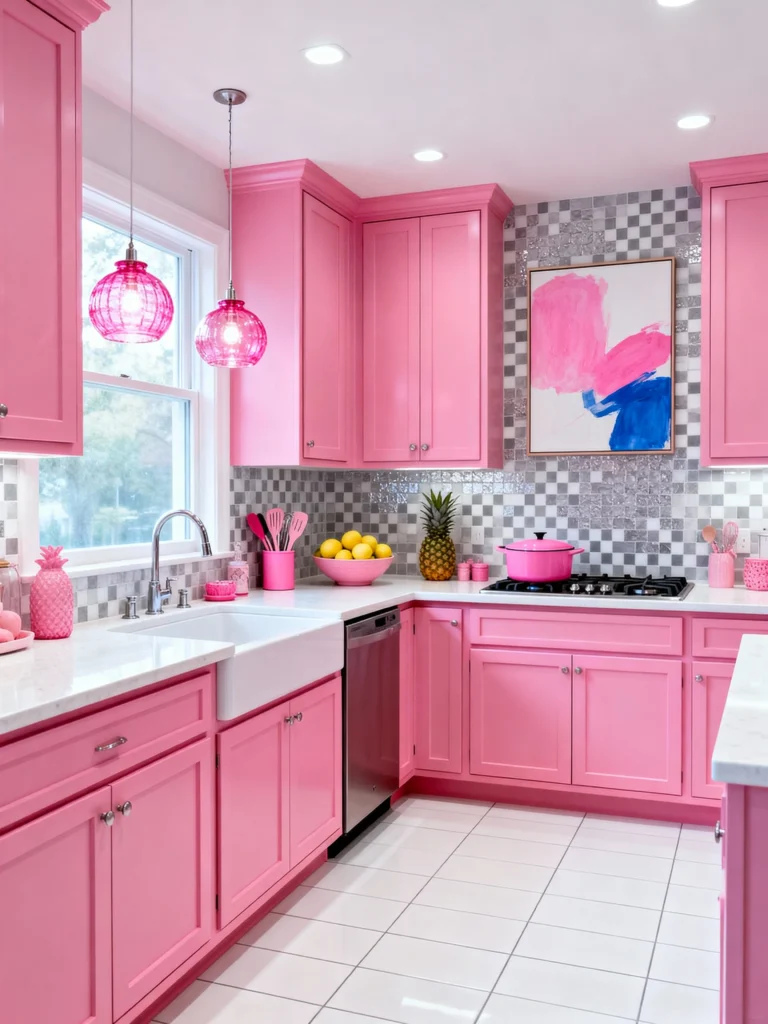 This kitchen is pure energy. The high-gloss fuchsia cabinets are undeniably the main event, instantly giving the space a dramatic, modern, and fun feel. To keep that energy going, the designer introduced a super cool, almost metallic checkerboard backsplash that reflects the light beautifully. Look at those amazing bright pink glass pendant lights hanging over the sink—they are so playful! My favorite part, though, is how they’ve incorporated modern art with that striking painting on the backsplash. It pulls in the pink while adding a contrasting pop of cobalt blue. It’s a high-impact, design-forward kitchen for someone who isn’t afraid of color!