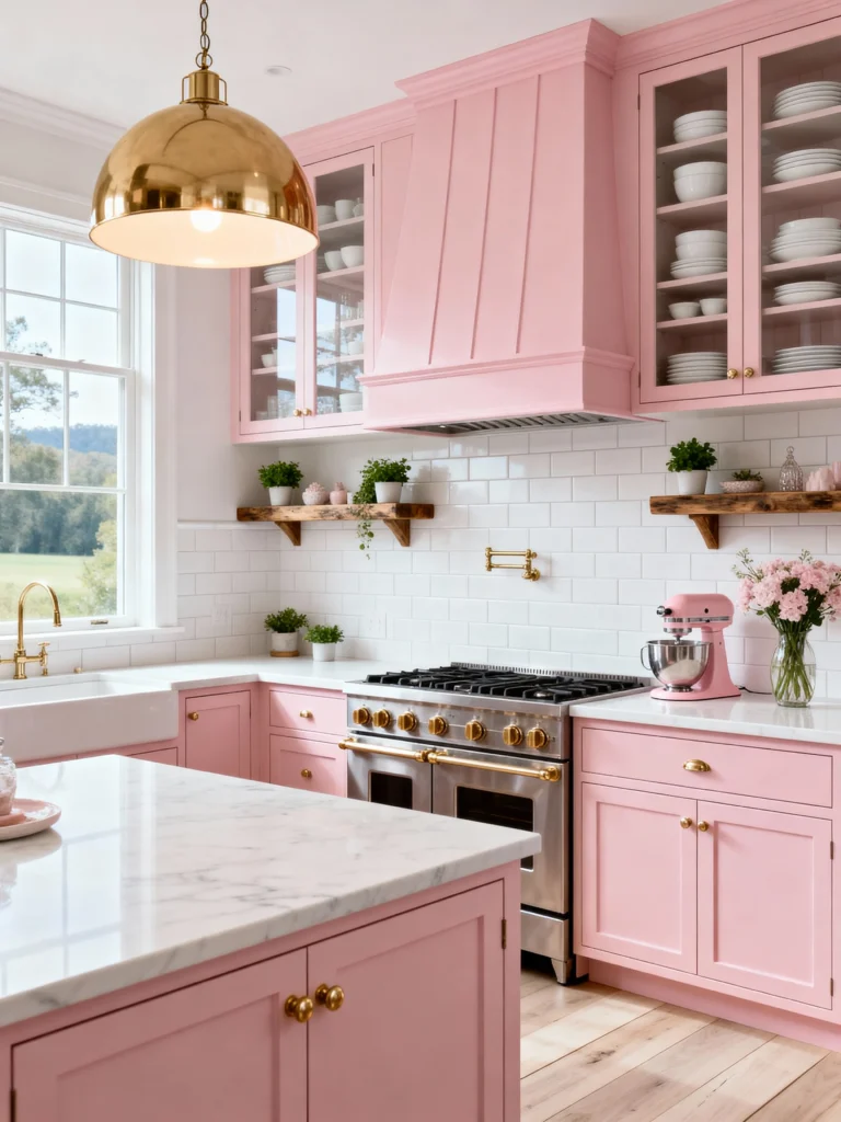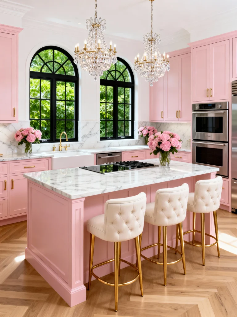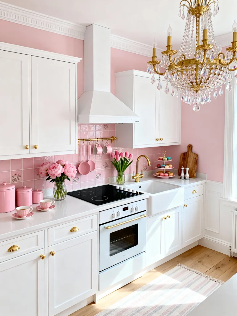 This kitchen is like a delicious French pastry—sweet, delicate, and utterly irresistible. Here, the blush pink is confined to the walls and the small square backsplash tiles, allowing the crisp white cabinetry to really shine. It creates a beautiful, airy balance. The gold hardware on the cabinets and the faucet adds a touch of warmth, but the centerpiece is definitely that spectacular crystal chandelier! It brings in that element of vintage glamour and a wonderful light-catching sparkle. And notice the small pink details, like the teacups and the peony bouquet, which tie the whole sweet aesthetic together. It’s a perfect blend of modern appliances with feminine, classic charm.