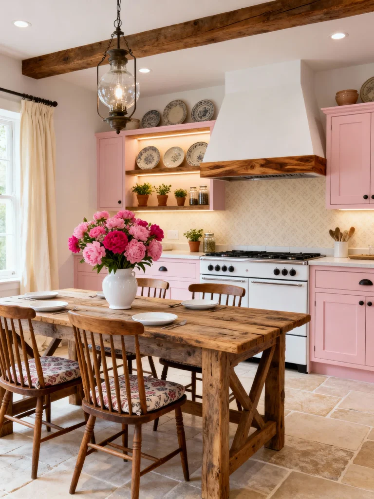 This is a pink kitchen with a deep, earthy soul! The pastel pink shaker cabinets are a beautiful counterpoint to the raw, rustic elements. The exposed dark wood ceiling beams and that incredible, chunky farm table and chairs give the space so much character and history. It’s a wonderful blend of rough-hewn charm and delicate color. The soft, patterned backsplash and the white appliances keep the pink from feeling overwhelming. This kitchen proves that pink can absolutely belong in a cozy, rustic environment, especially when paired with natural wood and a simple, warm stone floor. It’s an authentic, heartfelt, and beautiful design.