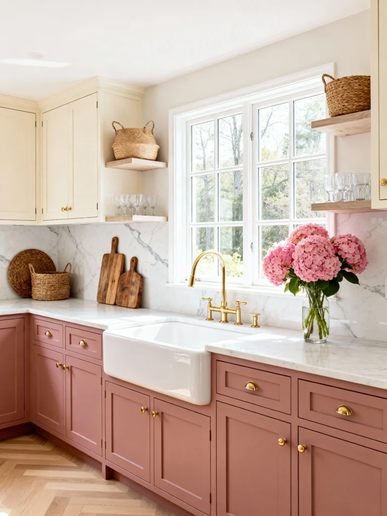 If you’re looking for a subtle way to embrace the pink trend, this kitchen is your inspiration! The lower cabinets are a beautiful, muted dusty-rose or mauve color—it’s sophisticated and grounded. The upper cabinets are a calm cream color, which prevents the space from feeling too heavy. The real beauty is in the texture: a stunning, continuous marble backsplash that brings elegance and movement to the walls. The brass hardware provides a warm sparkle, and those chunky wooden cutting boards and woven baskets add a perfect touch of rustic, functional style. This is a grown-up, beautifully composed pink kitchen that feels timeless.
