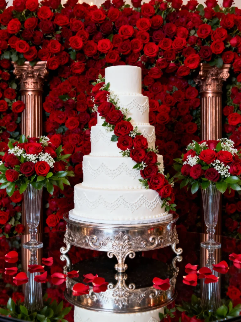 Let’s start with the showstopper—the cake! This isn’t just a dessert; it’s a piece of architecture. I love how the crisp white fondant provides a clean canvas for that cascading “S-curve” of deep red roses. It looks like the flowers are literally growing off the cake! Placing it against a solid wall of roses makes the whole moment feel immersive. It’s traditional but turned up to eleven.