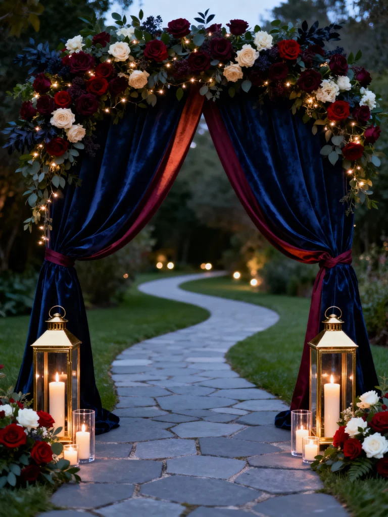 First impressions are everything, right? This walkway is so moody and mysterious. Using navy blue velvet curtains instead of standard white draping is such a bold, brilliant move. It creates this “theatrical reveal” as you walk down the stone path toward the ceremony. The lanterns at the base are the perfect touch to guide your guests as the sun goes down.