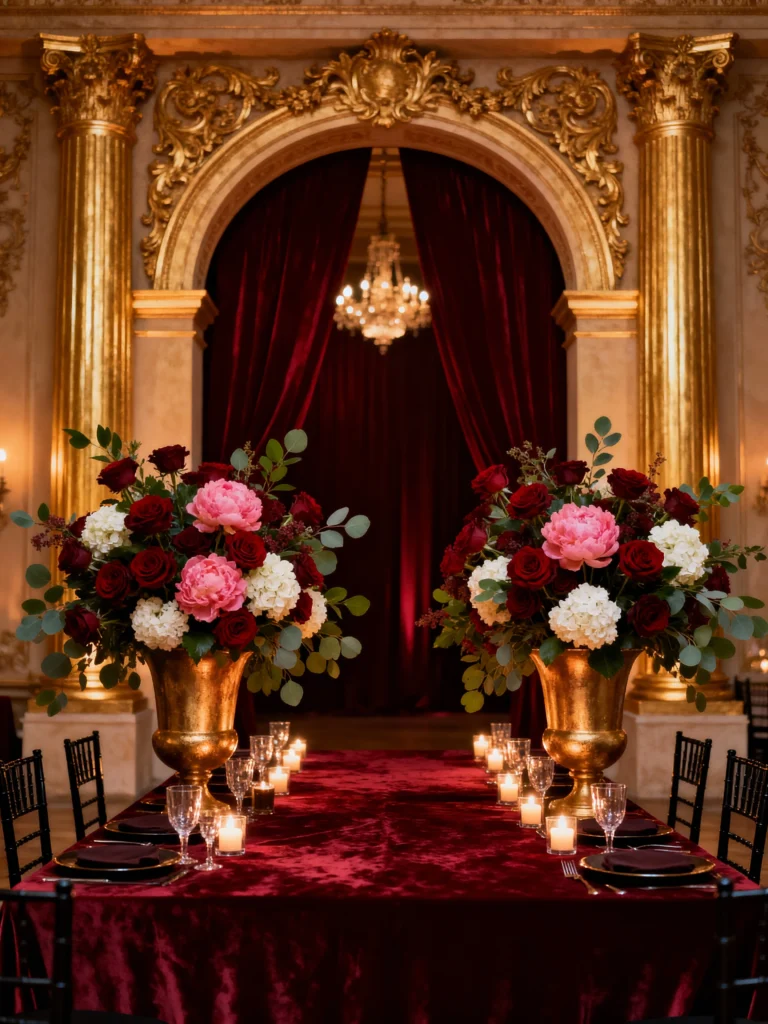 This setup is straight out of a period drama. We’re talking massive gold vases, towering peonies, and thick velvet tablecloths that you just want to sink your hands into. The gold columns and the chandelier in the background make the room feel expensive and historic. If you’re going for “Old World Opulence,” this is the blueprint.