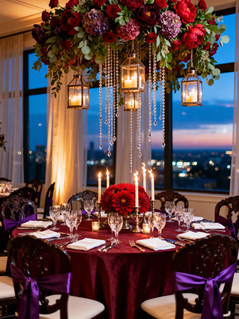 Can we talk about these hanging lanterns? Instead of a standard centerpiece, this table uses a massive floral “cloud” with crystals and glass lanterns dripping from it. It keeps the table clear for conversation but adds so much vertical drama. Against that city skyline at dusk, the candlelight reflecting off the crystal strings is just… chef’s kiss.