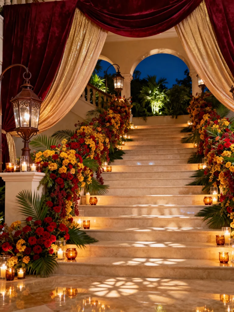 Talk about a grand entrance! These stairs are draped in what feels like miles of marigolds and roses. The copper lanterns and the warm “wash” of light on each step make the transition from one space to another feel like a journey. It’s warm, inviting, and makes every guest feel like they’re walking into a palace.