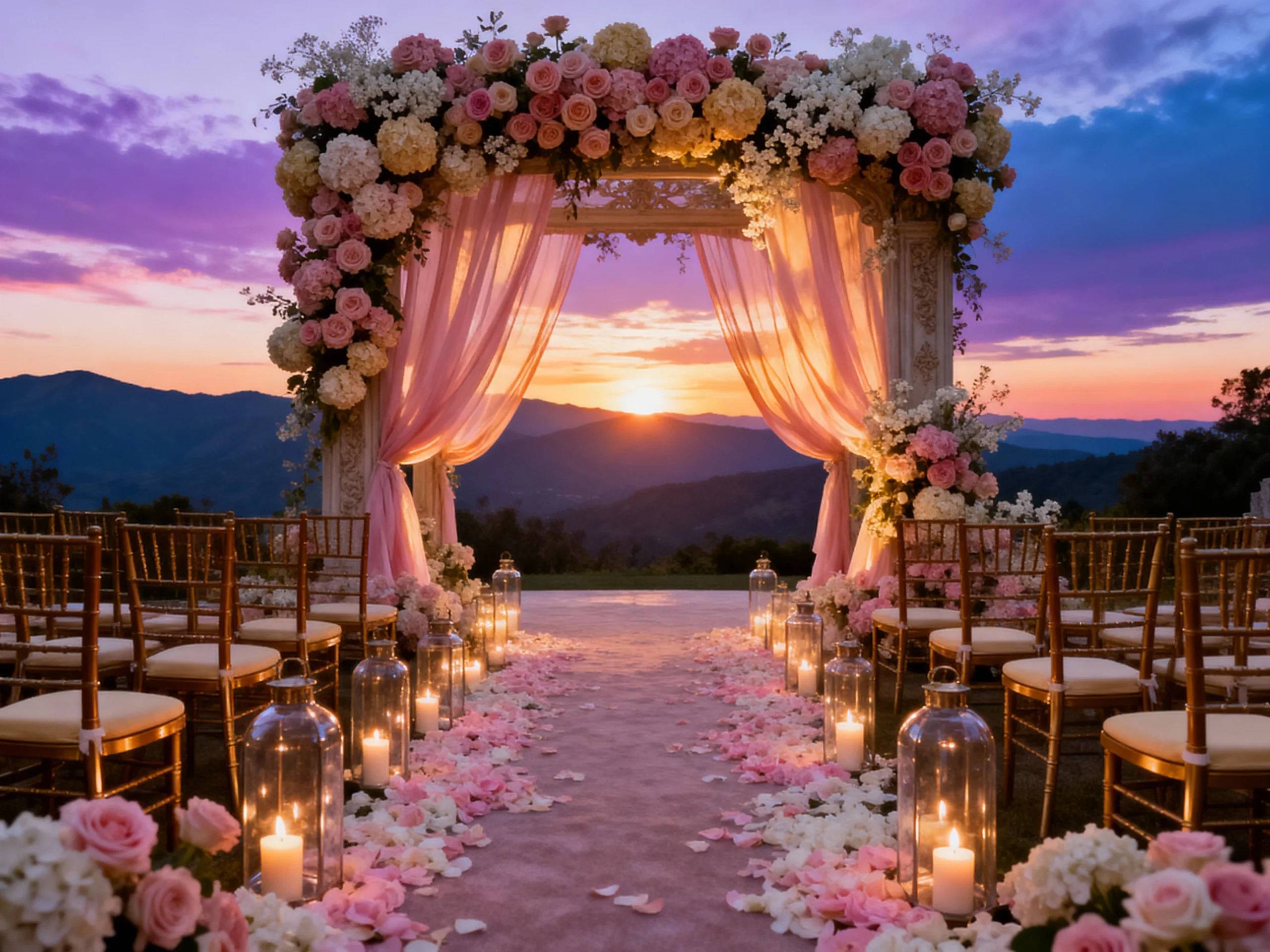 This is for the “Edge and Elegance” crowd. The use of black pampas grass and black draping on the arch is so sophisticated. It’s a bit gothic, a bit modern, and totally cool. The contrast of the dark structures against the sea of red rose petals on the ground is striking. It feels intimate, private, and very high-fashion.