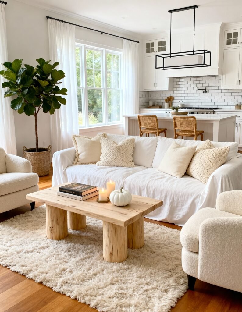 Isn’t this just the perfect spot for a lazy Saturday morning? I adore how the homeowners kept the palette super bright and neutral, creating such a clean, peaceful atmosphere. The layered textures, like the shaggy rug and the plush throws on the simple white slipcovered sofa, make it feel so inviting. And can we talk about that live-edge coffee table and the fiddle-leaf fig tree? They bring just the right amount of natural warmth. Plus, that open-concept kitchen situation? Dreamy!