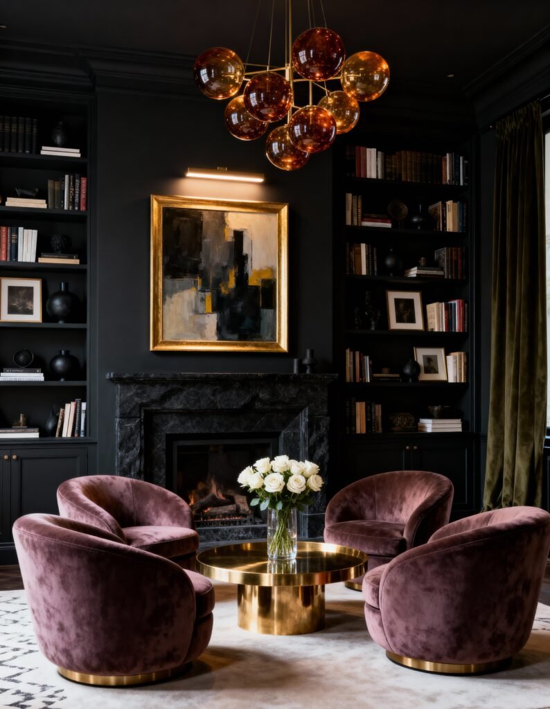The rich, mauve velvet swivel chairs clustered around the polished gold coffee table feel incredibly luxurious and intimate. The black walls and black marble fireplace create an amazing backdrop for the bright, warm art and that incredible amber glass bubble chandelier. It’s a perfect conversation space—stylish, moody, and totally high-end.