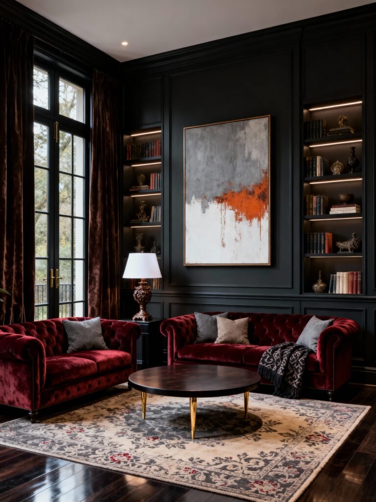 Talk about a power move! This room is all about dramatic elegance. The walls are painted a deep, rich black, which somehow makes the space feel cozy rather than cold. The star of the show has to be those deep red velvet Chesterfield sofas—they just scream luxury! The abstract art and the subtle lighting on the built-in shelves keep the whole look sophisticated and modern. It’s like the perfect mix of old-world charm and contemporary edge. I’d definitely grab a classic book and a glass of wine here.