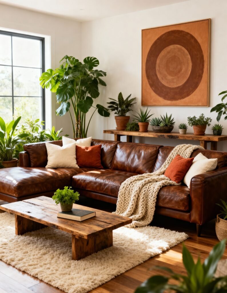 If you love plants, this one’s for you! This space perfectly blends a rustic, organic feel with mid-century modern comfort. The gorgeous caramel leather sectional is the perfect anchor, looking even better next to that rough-hewn wooden coffee table and chunky knit throw. But the real magic is the sheer amount of greenery! Having plants inside instantly makes a room feel alive and fresh, and they pair beautifully with the warm, earthy tones in the circular artwork. Total relaxation goals!