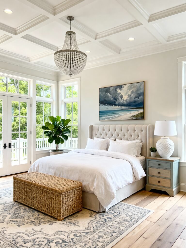 Okay, wow. This bedroom is what dreams are made of—it feels like a luxury vacation suite! The high, coffered ceilings and the massive windows just flood the room with natural light. The palette is all soft, soothing neutrals, letting the stunning outdoor view be the main focus. The woven trunk at the foot of the bed and that striking beaded chandelier add texture and elegance. It’s the perfect, calming escape for unwinding after a long day. Pure bliss!