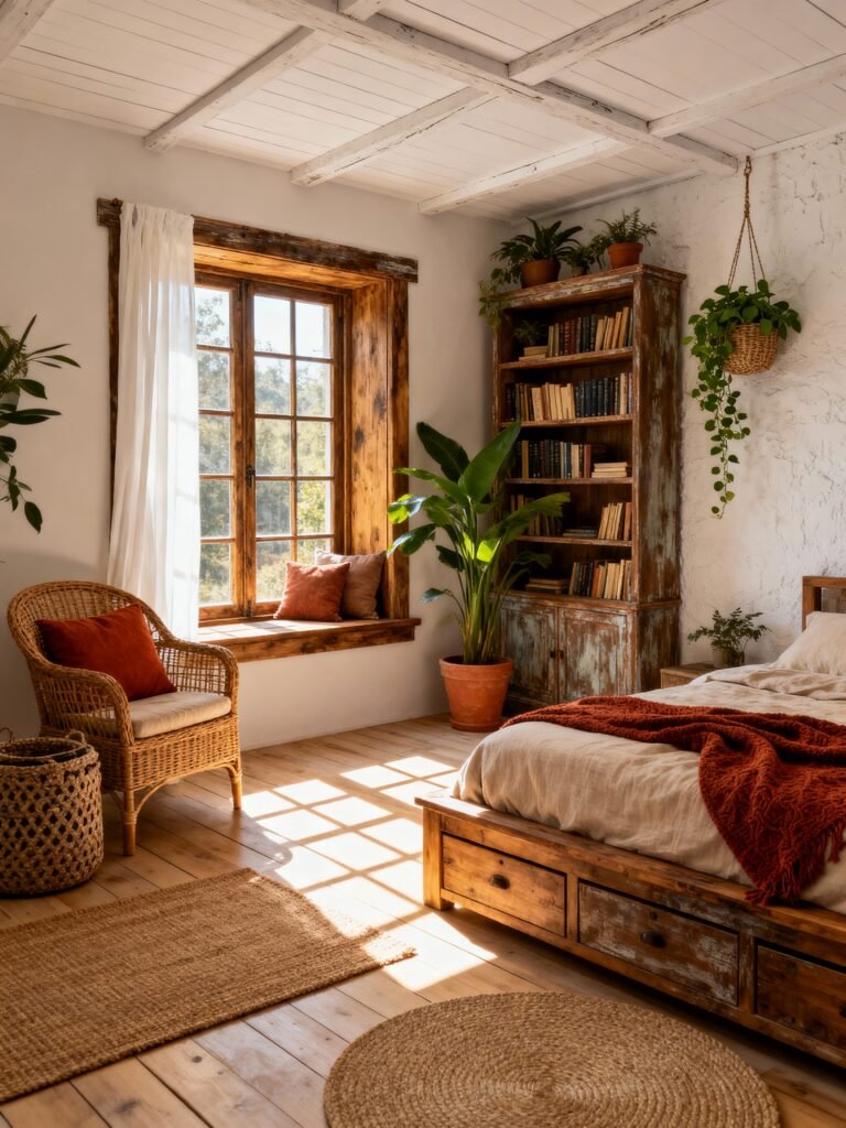 This room is radiating warmth! The distressed wood textures and the heavy use of warm tones like the terracotta and burnt orange create such a cozy, comforting feel. That built-in window seat is such a sunny little nook for reading, especially with those thick, natural wood frames. I love the rustic, worn look of the wooden bookshelf and the simple, natural materials like the jute rug. It’s a perfect mix of bohemian and cozy cabin vibes!
