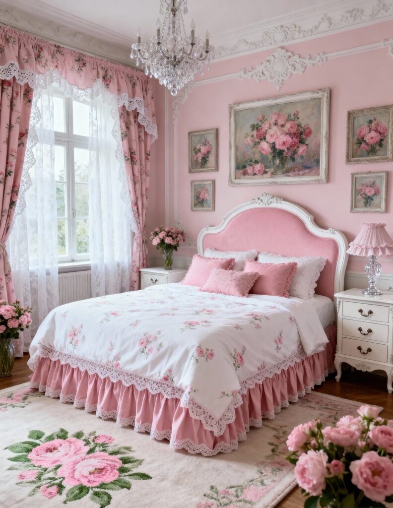 This bedroom is a total romantic fantasy. The layered pink floral patterns—on the walls, the curtains, the bedding, and the area rug—are all gorgeously coordinated. The crystal chandelier and the intricate white plasterwork on the walls and ceilings elevate the whole look. It’s a beautifully unapologetic expression of feminine, vintage style, complete with rose paintings and a ruffled bed skirt. Absolutely charming!