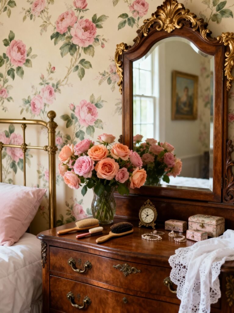 This close-up gives you a wonderful sense of intimate, vintage charm. The ornate gold-framed mirror and the rich, burl wood dresser are such classic pieces. The focal point, of course, is the lush bouquet of pink and peach roses, perfectly complementing the soft, antique rose wallpaper. Everything from the small jewelry boxes to the brass bed frame in the background makes this feel like a beautiful, cherished space. So elegant!