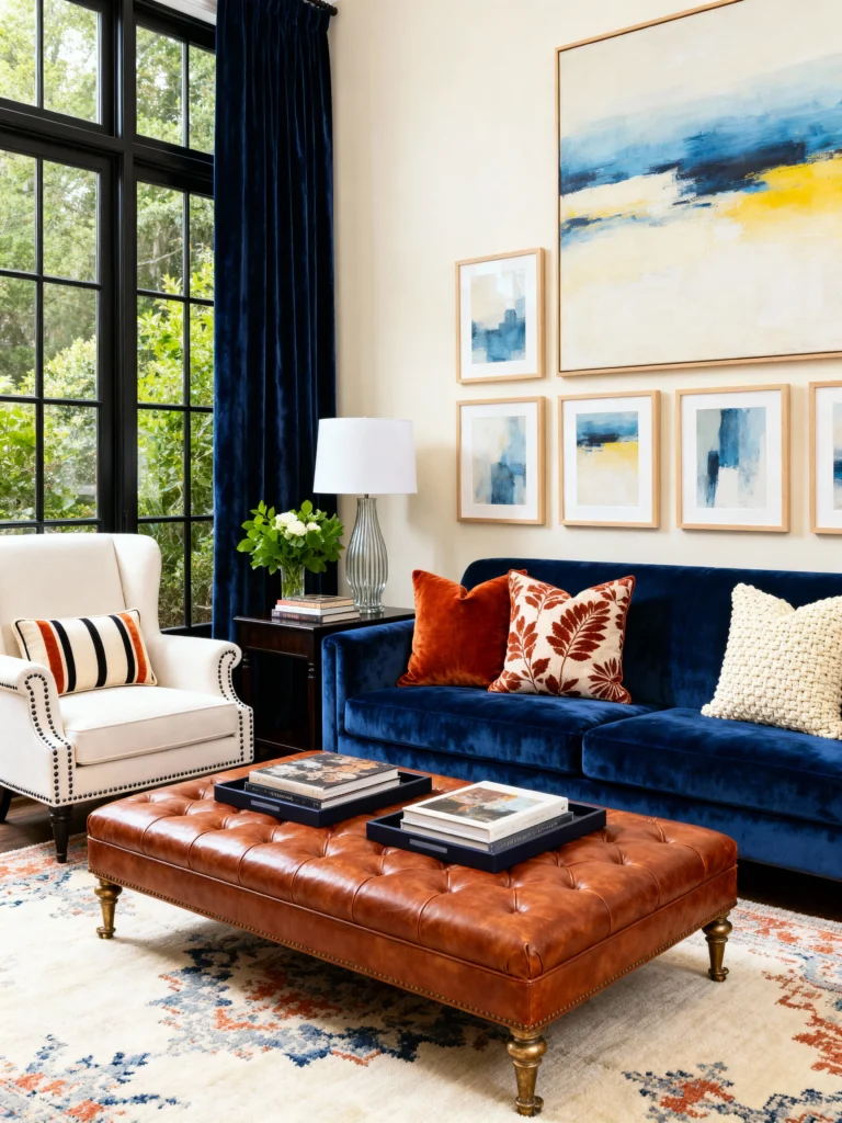 This living room proves that you can mix bold colors and different styles with confidence. The deep, rich navy velvet sofa and matching drapes provide a stunning anchor, contrasting beautifully with the bright white armchair and walls. The unexpected pop of rust-orange from the throw pillow and the gorgeous brown leather ottoman tie in the abstract artwork hanging above. It’s sophisticated, vibrant, and perfectly balanced.