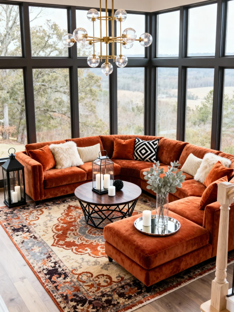 This living room is all about making a statement with its deep, velvety orange sectional. It’s perfectly positioned to soak up that incredible natural light and maximize the gorgeous view outside. The color palette—burnt orange, creams, and earthy tones—creates a super warm and inviting atmosphere. I love how the traditional rug grounds the modern furniture and the stylish gold chandelier adds a touch of rustic opulence. It’s the ultimate cozy spot for lounging!