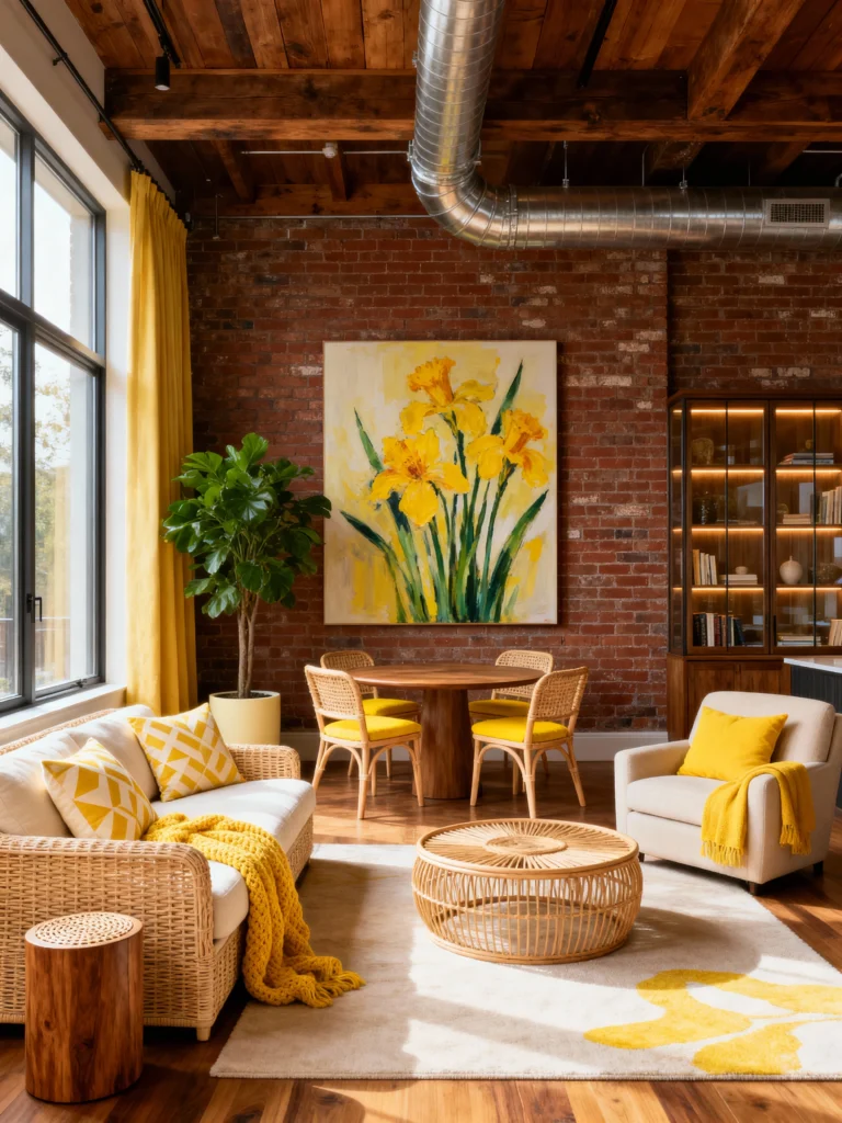 This room expertly blends industrial elements—exposed brick, ductwork, and a wood plank ceiling—with bright, cheerful decor. The brilliant yellow accents, from the artwork and throws to the dining chairs, instantly lift your mood. The natural wicker furniture and the large fiddle-leaf fig tree add organic texture, balancing the harder architectural features. It feels like the perfect, vibrant spot for a coffee date or a lazy afternoon read.