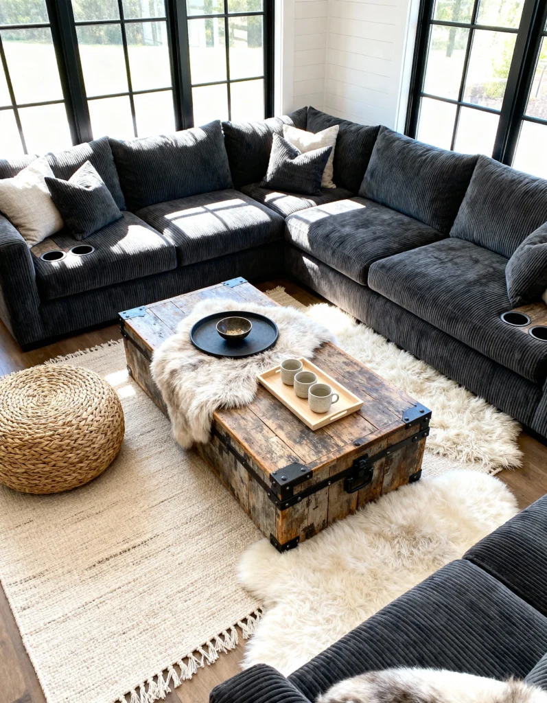 If you love neutrals but want a room that feels anything but boring, take a page from this look! The plush, charcoal corduroy sectional looks unbelievably comfortable—I mean, who wouldn’t want to sink into that? It’s all about texture here: the shaggy sheepskin rugs, the chunky woven pouf, and that unique, rustic wood trunk coffee table. The neutral palette keeps the focus on the varying materials, creating a cozy and modern Scandi-meets-rustic retreat.