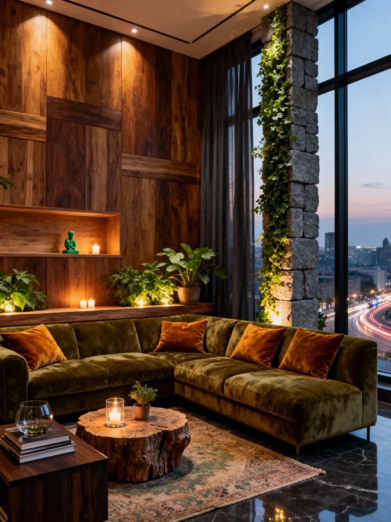 This living room is a masterclass in blending luxury with nature! The deep olive-green velvet sectional and the rich wood-paneled walls create an intimate, sophisticated vibe, especially when paired with those stunning, warm gold pillows. But the coolest part has to be the towering window that brings the city view in, framed by that gorgeous stone column wrapped in climbing greenery! It feels like a private, elevated sanctuary with a breathtaking backdrop.