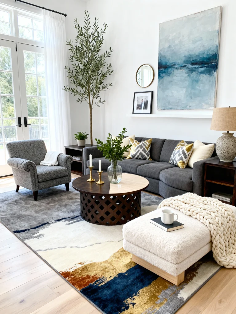 Here’s a beautiful example of a bright, modern, and perfectly balanced room. The large, dark gray sectional provides a solid base, complemented by a lovely mix of patterned and solid neutral pillows. But the real wow factor comes from the rug: its bold strokes of navy, gold, and rust instantly transform the space. Paired with the clean white walls and the beautiful olive tree, it feels fresh, airy, and grounded all at once.