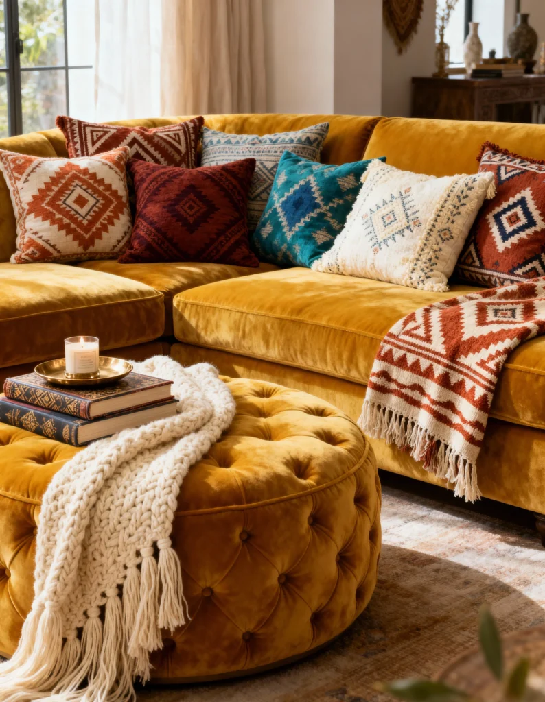 Oh my goodness, this room is dripping with cozy, bohemian charm! The plush, mustard-yellow velvet sectional looks incredibly inviting, especially piled high with textured, patterned pillows in warm, earthy tones like terracotta, cream, and deep blue. The tufted velvet ottoman doubles as a coffee table, holding a beautiful stack of books and a cozy knit throw. It’s all about layering colors and patterns to create a vibrant, snug, and globally-inspired retreat.